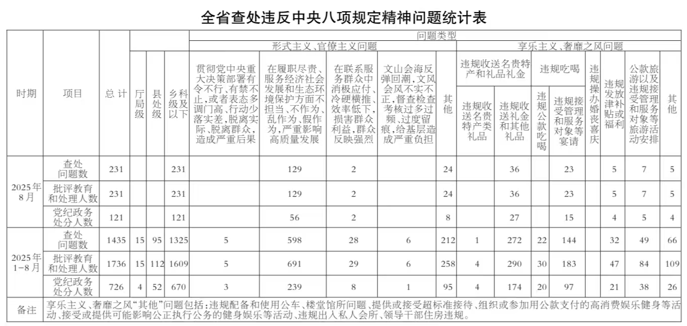 為持續加固中央八項規定堤壩,以嚴的基調、嚴的措施、嚴的氛圍深入推進作風建設常態化長效化,現將2025年8月全省查處違反中央八項規定精神問題有關情況通報如下: