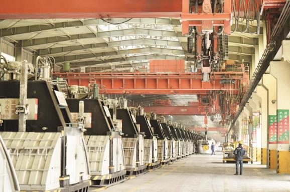 生產車間里,巨大的電解槽整齊排列,如同一座座鋼鐵堡壘,閃耀著金屬的光澤。隨著多功能天車在技術工人的控制下緩慢滑行,一個個裝滿鋁液的巨大鋁包被高高吊起,運送到電解槽旁,裝滿鋁液后運出電解車間。