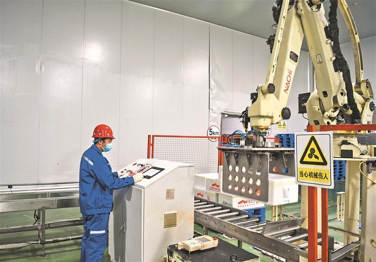 龍洋知鮮機械臂抓取三文魚貨箱。張鵬 攝