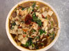 煮熟的牛、羊的頭、心、肝、肺、腸、胃、蹄等切片,舀原湯汁,加調料,即成。雜碎柔、嫩、爛、脆,湯香味濃。青海最有名氣的“羊雜碎”要數里離市區25華里處的大通后子河雜碎館。