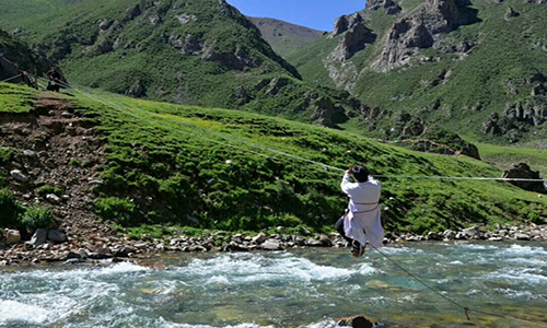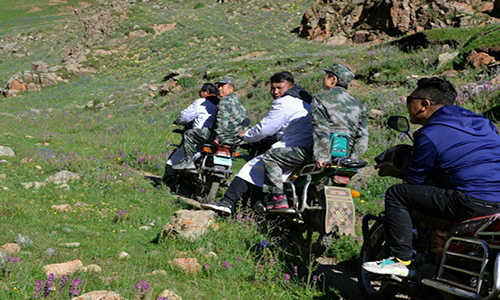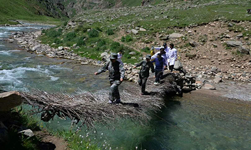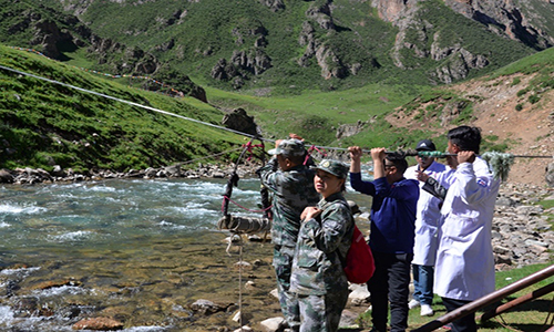 高原深處,地形復(fù)雜,沒有道路,只得騎摩托車前行。在崎嶇的山路中,摩托車常常倒翻,解放軍第107醫(yī)院婦科專家位軍幾次被甩掉車座,小腿部多處淤青。在最為艱難的路段,不少隊員不得不下車幫著騎手推摩托,翻山越嶺、爬山涉水、過索道、走浮橋,蘇魯鄉(xiāng)衛(wèi)生院醫(yī)生尕瑪桑周在幫助軍醫(yī)渡過牧民自制浮橋時,不慎跌入湍急的河流中,喝了好幾口水,而且還丟掉了手機。