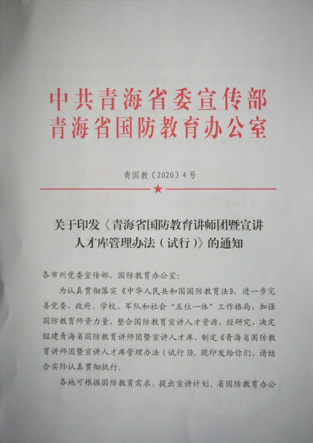 關于印發《青海省國防教育講師團暨宣講人才庫管理辦法(試行)》的通知