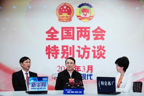 2013年3月4日,全國人大代表、江蘇省教育廳廳長沈健(中)、江蘇淮陰中學校長張元貴(左)做客新華網兩會訪談,與網友談教育要惠及更多百姓,以及中學教育相關問題。新華網李欣攝