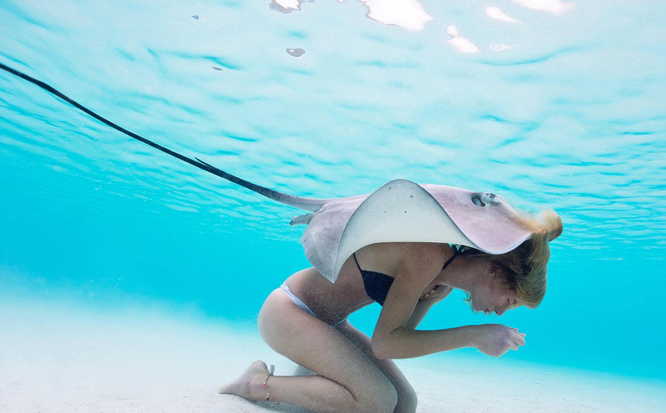 這些驚人照片都是55歲水下攝影師科勒姆貝拍攝的,他說:“對于與黃貂魚如此接近,很多模特表示擔憂。但有三四個模特想要嘗試潛入水中喂魚,他們的互動很奇特,盡管最初顯得有點兒害怕。”
