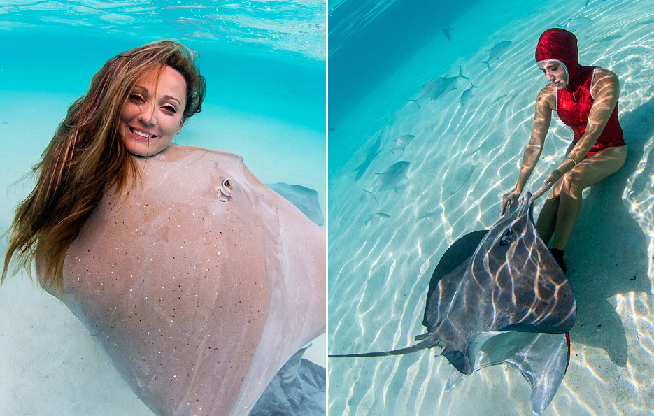 比基尼美女與致命黃貂魚親密共泳