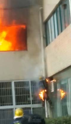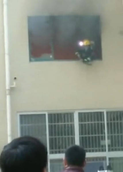 消防員在著火房間的窗邊試圖將水帶連接到房?jī)?nèi),不料明火點(diǎn)燃了他身上的衣服,樓下群眾見(jiàn)狀紛紛驚呼:“快下來(lái)!快下來(lái)!”。