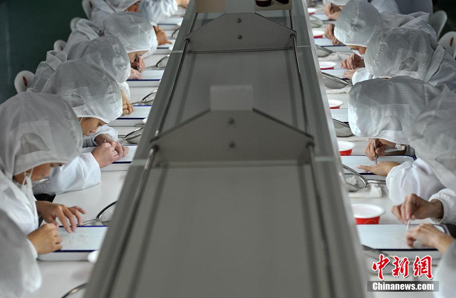 12月29日,工人們正在給泡在活化水中的燕窩挑練摻雜其中的燕毛。當日,記者走進在廈門一燕窩加工企業,200多名員工正在生產車間認真細心給燕窩中的殘余羽毛給挑練出來。據了解,該工種對體力要求不高,但在招聘時首先要求其視力要好且要細心,以女性為主。張斌 攝