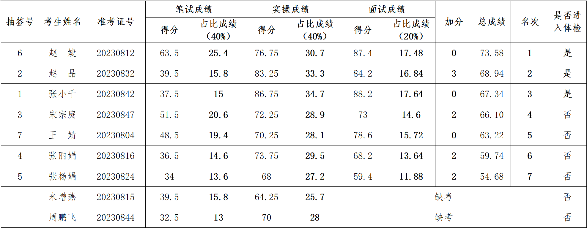 1.考生總成績根據筆試、實操、面試成績占比,以及加分項之和計算(總成績保留兩位小數),按照招聘崗位1:1的比例確定進入體檢人員名單。