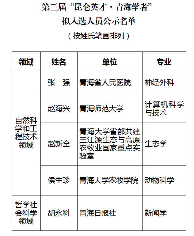 根據(jù)《“青海學(xué)者”計(jì)劃實(shí)施辦法》(青辦發(fā)〔2017〕60號)和《關(guān)于印發(fā)2022年度“昆侖英才”行動計(jì)劃實(shí)施方案的通知》(青人才字〔2022〕11號)要求,經(jīng)個(gè)人申請、單位推薦、逐級把關(guān)、部門初選、專家評審等,確定張強(qiáng)等5人為第三屆“昆侖英才·青海學(xué)者”擬入選人員,其中自然科學(xué)和工程技術(shù)領(lǐng)域4名,哲學(xué)社會科學(xué)領(lǐng)域1名(具體人員名單附后)。