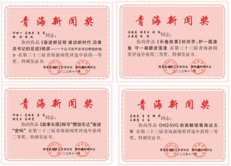 在第三十三屆青海新聞獎評選中,新聞中心選送的4件融媒體作品獲獎。其中,《【奮進新征程 建功新時代 沿著總書記的足跡】班彥——一個讓習近平總書記牽掛的地方》作品獲得一等獎;《【長卷故事】祁洪芳:護一尾湟魚 守一湖碧波蕩漾》《【故事長圖】探尋“攢勁東達”奮進“密碼”》2件作品獲得二等獎,《【H5】SVG動畫解鎖青海這五年》作品獲得三等獎。