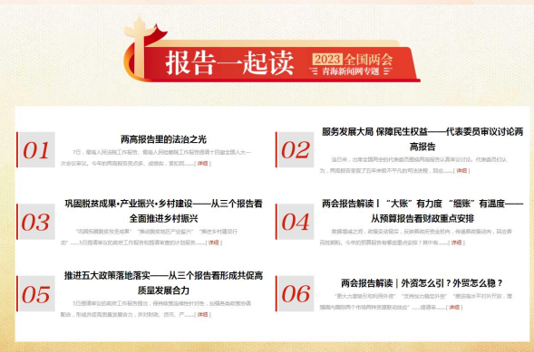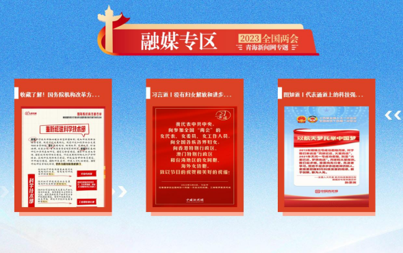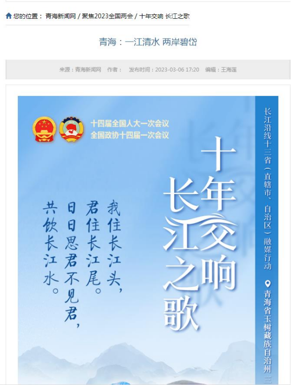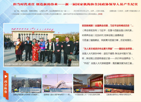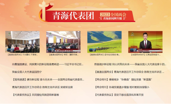 2. 全國全省兩會宣傳。及時推出全國兩會專題,設置全網飄紅,營造良好會議氛圍。青海新聞網、大美青海客戶端共刊發兩會相關報道3000余篇/條,總閱讀量700萬+。與多省份聯動宣傳,制作推出【互動H5】“糧”辰美景幸福田、《手繪H5 | 萬里長城萬里長》等多部作品,取得良好的宣傳效果,重點原創稿件《青海:一江清水 兩岸碧岱》全網閱讀量突破100萬人次。新媒體共集納發布相關報道400余篇/條,閱讀量達140多萬人次。全省兩會中,緊密結合政府工作報告和群眾關心的話題,制作推出15件融媒體產品,閱讀量超過50萬人次。