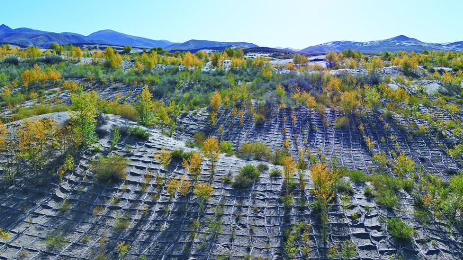 “白色方格就是沙障,用尼龍袋裝沙做成連片的方格,用來固沙。這些楊樹是沙地楊樹深栽旱作造林技術(shù)成果,選用1.5米左右的青楊苗木,在沙地中深挖1米進(jìn)行栽植。”