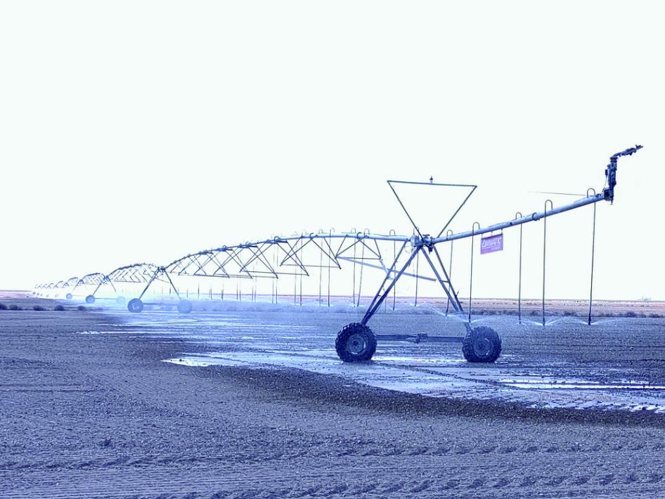 沿路上,一邊泛白的鹽堿地和砂礫地,與另一邊平整無垠的改良土壤形成鮮明對比,延展臂膀的大型噴灌機(jī)行駛在改良地里,不一會兒就讓干燥的土壤喝飽了水。如果是夏天,一邊是綠油油的苜蓿,一邊是不長草的沙地,對比更明顯。