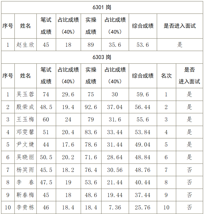 1.進入面試人員名單根據(jù)筆試與實操成績占比之和,由高到低按照招聘崗位1:3的比例確定。