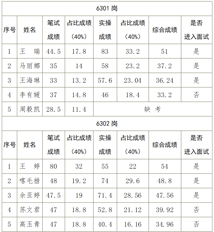 1.進入面試人員名單根據筆試與實操成績占比之和,由高到低按照招聘崗位1:3的比例確定。