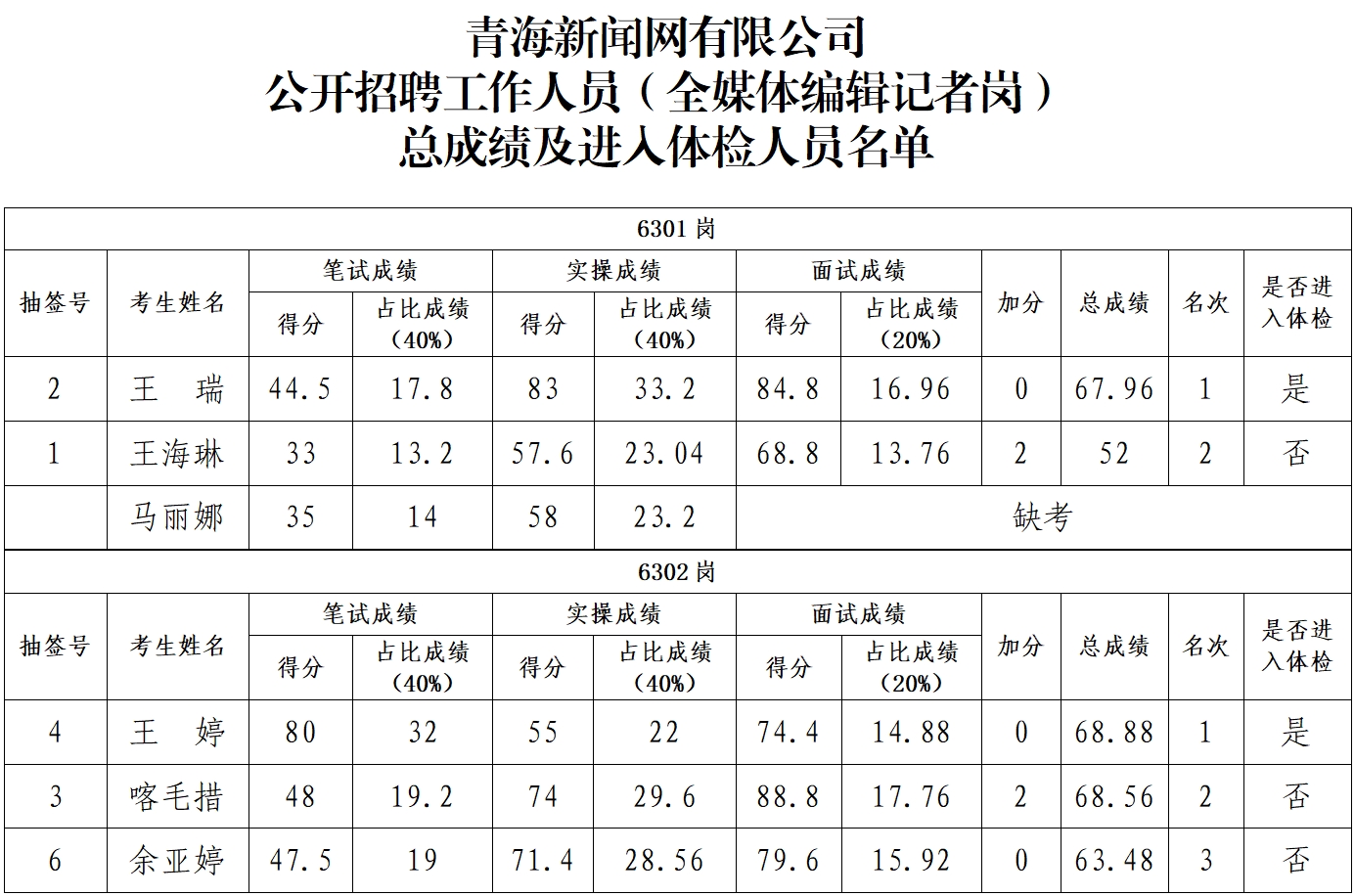 現將參加青海新聞網有限公司面向社會公開招聘工作人員(全媒體編輯記者崗)總成績予以公布,并對體檢、政審等有關事項通知如下: