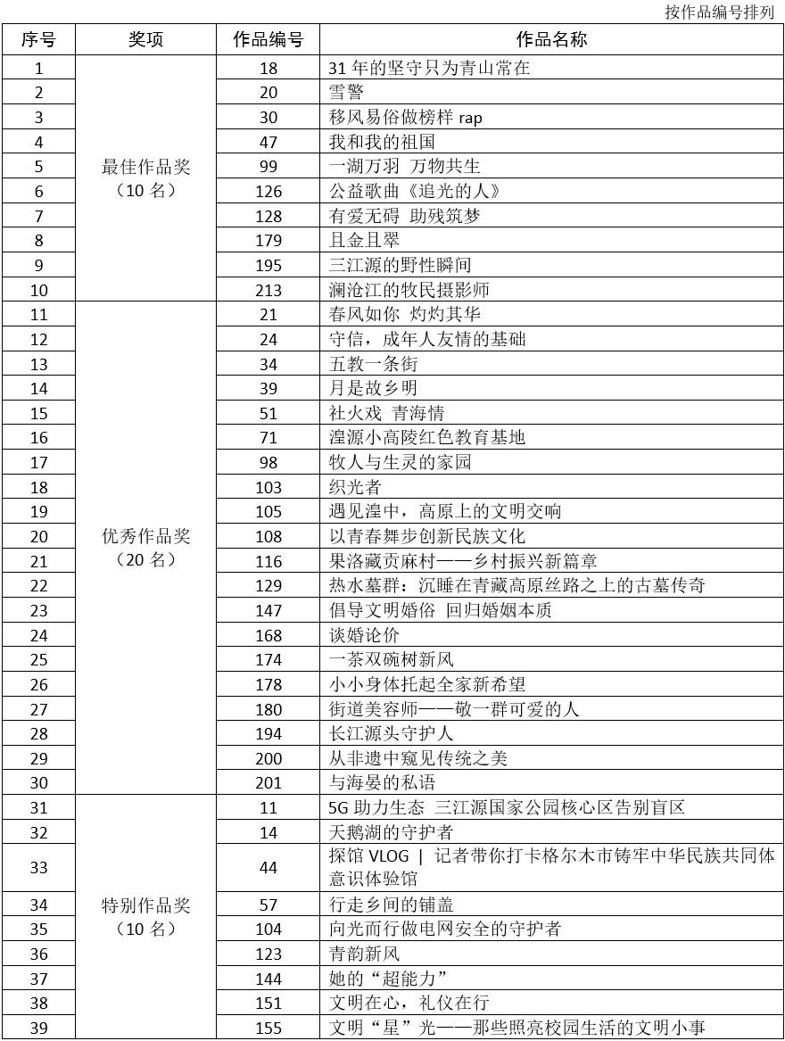 綜合網絡投票和專家評審,評選出最佳作品獎10件、優秀作品獎20件、特別作品獎10件。現將評選結果在青海新聞網和“江源新聞”客戶端進行公示,公示期為2025年11月10日至2025年11月14日。公示期間,單位和個人均可通過來電、來信等形式,對擬獲獎作品進行實事求是、客觀公正地反映,并提供事實依據。
