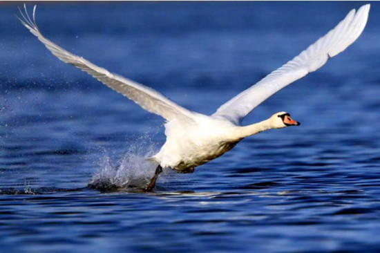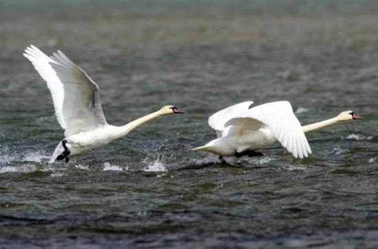 疣鼻天鵝從水面飛起。