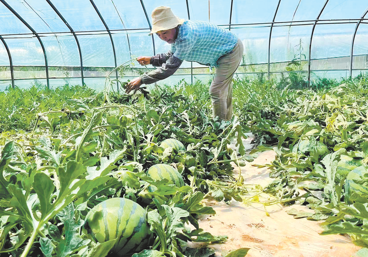 新莊村種植戶正在給西瓜澆水。李小英 攝