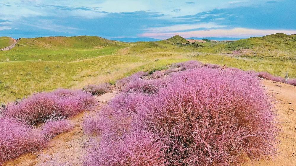 站在沙珠玉鄉(xiāng)的山頂遙望,草木以頑強的生命力蔓延到沙漠最深處,黃色的檸條花點綴其間,幾只野兔懶洋洋地躲在樹蔭下發(fā)呆。而此時的木格灘景色更驚艷,眼前皆是蒼翠,一簇簇粉色、紫色的野花開滿沙丘……防沙治沙是海南州推進生態(tài)環(huán)境保護的關(guān)鍵環(huán)節(jié)。