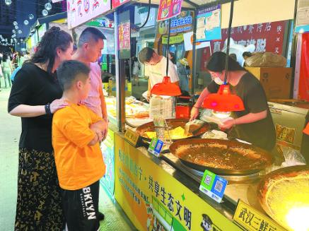 “老板來(lái)份鐵板豆腐,多放點(diǎn)辣。”“煎餅要加里脊肉嗎?”小吃街,誘人的美食香氣撲鼻而來(lái),伴隨著音樂(lè)聲燒烤師傅熟練地拿起沾滿醬汁的刷子給肉串“粉刷”,翻、烤、壓、刷,一套動(dòng)作行云流水。