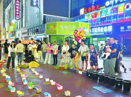 “中啦!中啦!”隨著歡呼聲,老板走進(jìn)攤位拿起被套中的毛絨玩具送給小朋友,一旁圍觀的人也躍躍欲試。張?chǎng)┱f(shuō),吃完晚飯,帶孩子來(lái)溜達(dá),既能消食,還能瞧見(jiàn)許多新奇玩意兒。