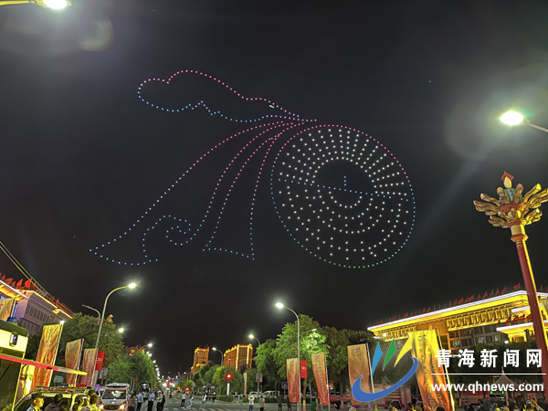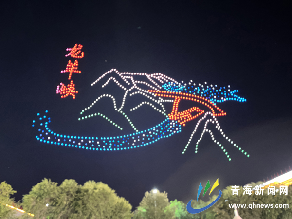 800多架無人機從地面緩緩升空,夜空瞬間被點亮,升空的無人機不停變換陣型,精美展現出“聽黨話、感黨恩、跟黨走”“民族團結的人民最幸福”“慶祝海南藏族自治州成立70周年”“青海湖”“龍羊峽”等字樣和圖案的畫面。無人機表演秀以聲光電現代科技與海南州民族文化完美融合,新奇炫酷的形式給廣大觀眾帶來一場不一樣的視覺沖擊,現場令人無比震撼。