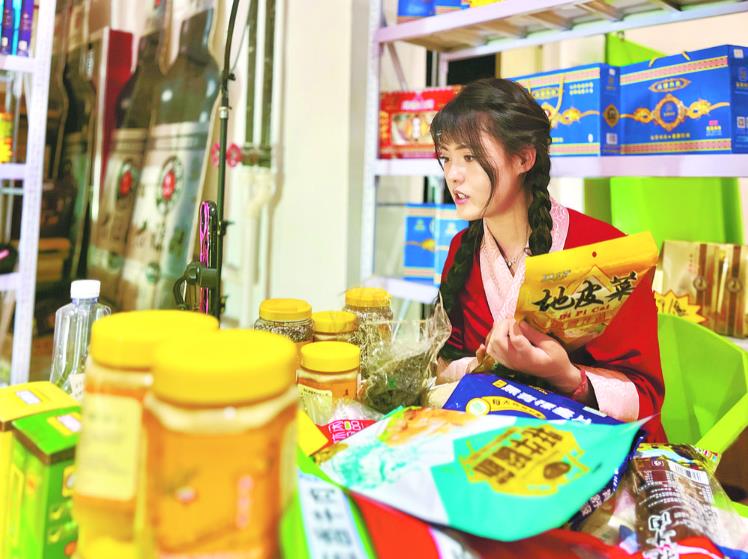 主播身穿民族服裝,手拿一罐枸杞花蜜正對著鏡頭講解產品,桌上藜麥、青稞麥片、青稞掛面、青稞奶茶等特色產品滿滿當當。
