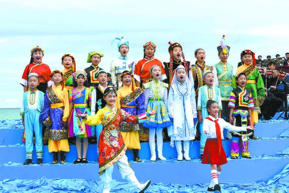 “在那遙遠的地方,有位好姑娘……”來自青海省青少年活動中心合唱團的20名小朋友,身穿鮮艷的青海民族服飾,在碧水藍天間領唱王洛賓先生的《在那遙遠的地方》,清澈空靈的童聲宛如天籟,將現場觀眾帶入美妙、歡樂、和諧的音樂世界。