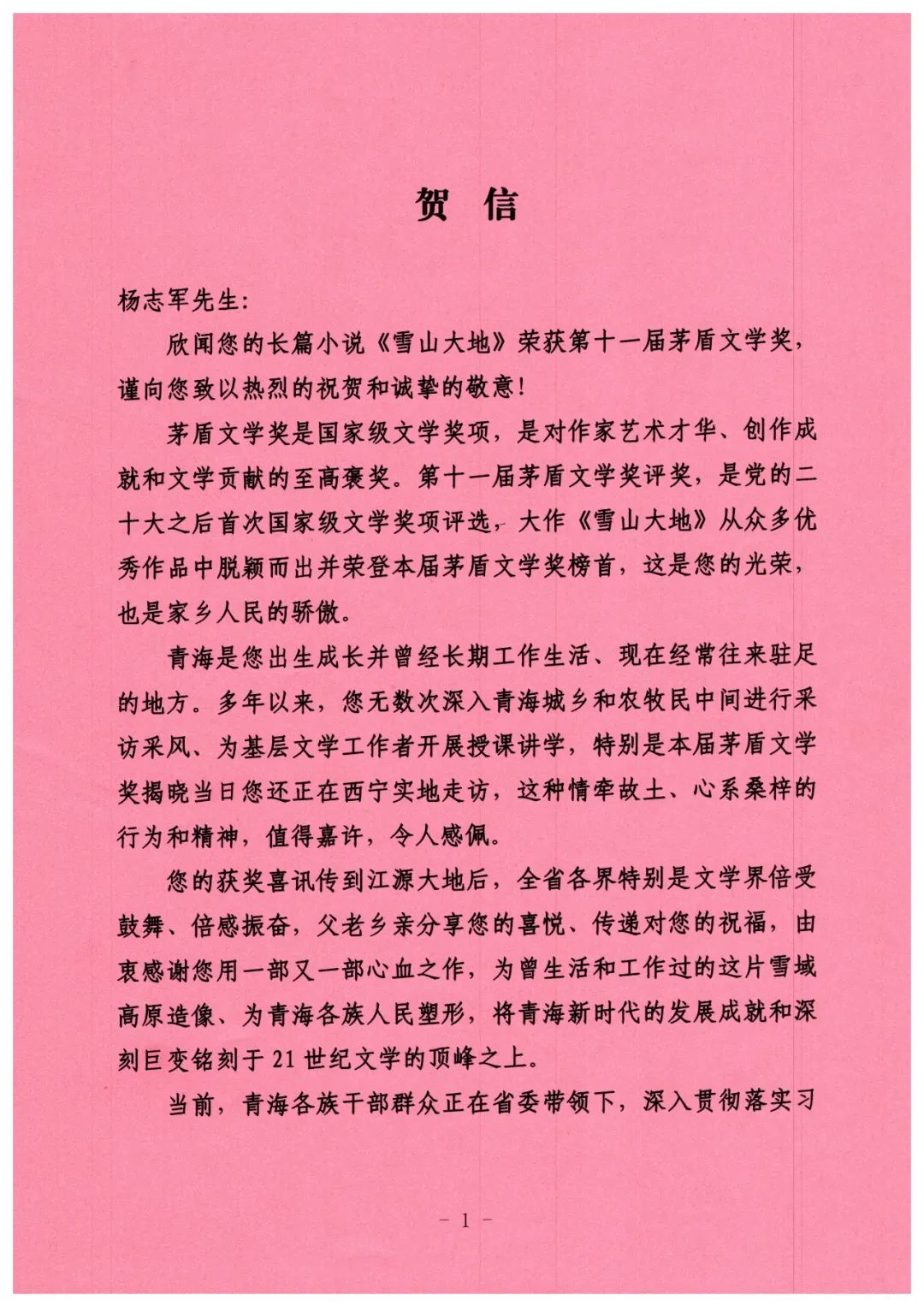 為感謝楊志軍先生以文學高峰之作為曾生活和工作過的雪域高原造像,為青海各族人民塑形,中共青海省委宣傳部聯合省文聯、省作協向楊志軍先生致信祝賀。