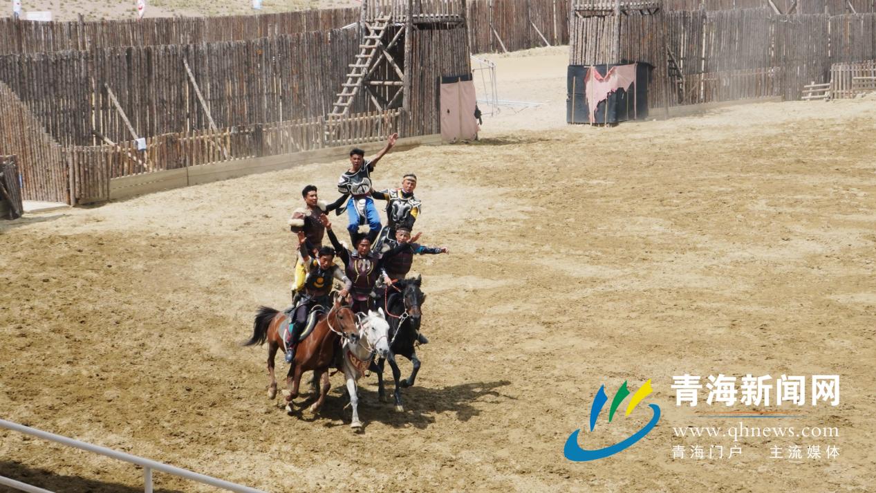 印象茶卡之《草原英雄-成吉思汗》。大型實(shí)景馬術(shù)演藝劇。由40多位馬術(shù)精湛的演員傾情上演。跌宕起伏的故事情節(jié)配以精湛的馬術(shù)表演,體現(xiàn)了蒙古族博大精深的草原文化,讓觀眾身臨其境感受其中魅力!謝青玉 攝