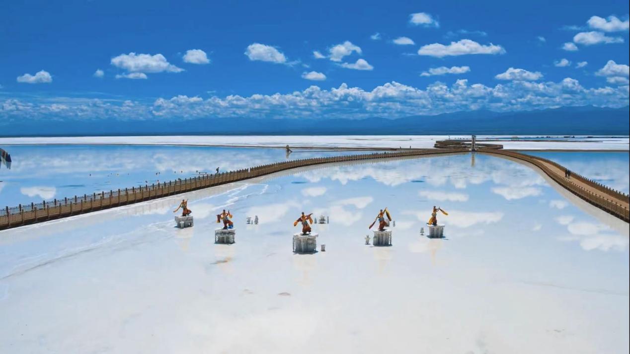 印象茶卡之《鹽湖飛天舞》。《飛天舞》來自敦煌莫高窟的壁畫。身穿青綠色唐代服飾的演員,彩衣舒展,身姿曼妙,舞姿瀟灑的遨游在鹽湖之上,天際之間。(景區(qū)提供)