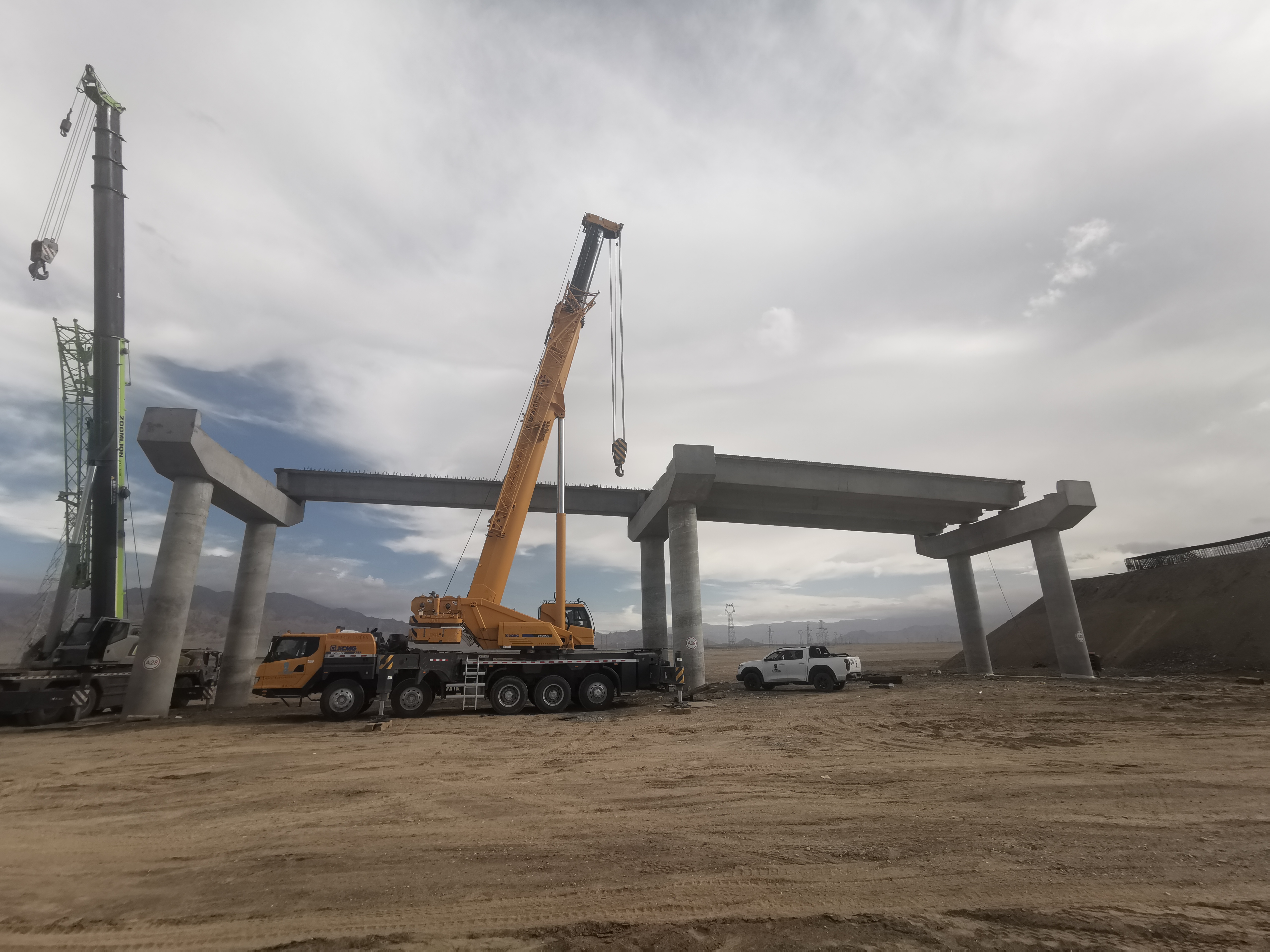 跨青藏鐵路橋是該項目中的控制性工程,施工工期長、技術(shù)難度高、安全風(fēng)險大。橋梁設(shè)計長度687米,分主橋和引橋兩部分,引橋共設(shè)計箱梁116片。本次架設(shè)的首片箱梁設(shè)計長度20米,重量55噸,采用兩臺大型汽車吊協(xié)同作業(yè)完成架設(shè)。