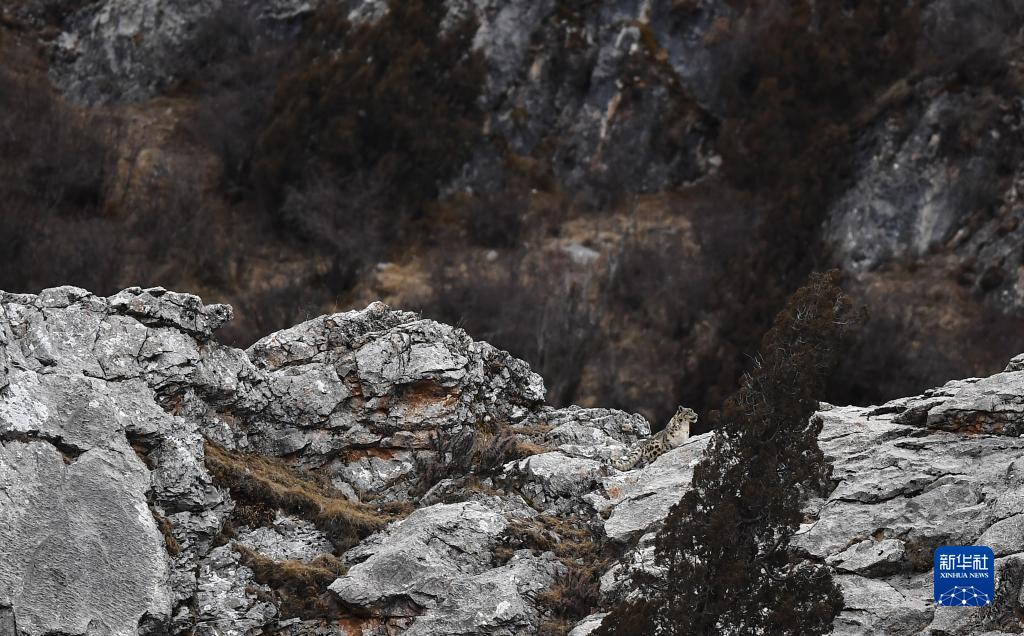 一只雪豹在位于三江源國家公園瀾滄江源園區內的青海省玉樹藏族自治州雜多縣昂賽大峽谷內休息(2023年2月21日攝)。新華社記者 張宏祥 攝