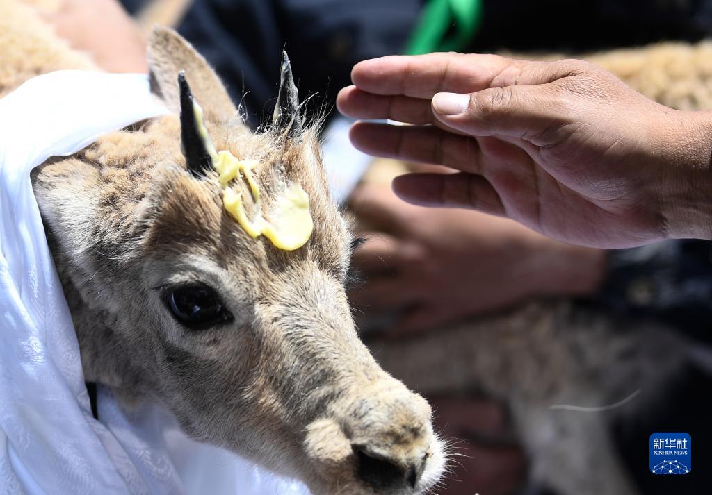 2021年7月7日,在可可西里索南達杰保護站野生動物救助中心,三公兩母共五只人工救助的藏羚羊被放歸大自然。可可西里巡山隊員按照風俗,在藏羚羊額頭上涂抹酥油表達祝福。新華社記者 張龍 攝