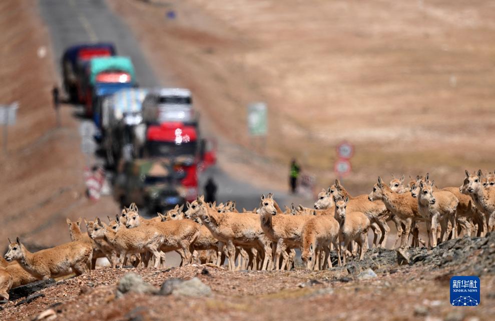 一群待產雌性藏羚羊正在通過青藏公路前往可可西里卓乃湖產仔(2023年5月29日攝)。新華社記者 張宏祥 攝