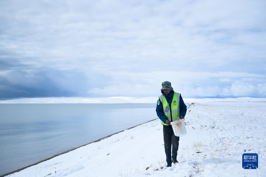 2021年10月20日,在青海省果洛藏族自治州瑪多縣扎陵湖鄉勒那村,三江源國家公園黃河源園區生態管護員俄措在扎陵湖邊撿拾垃圾。新華社記者 張龍 攝