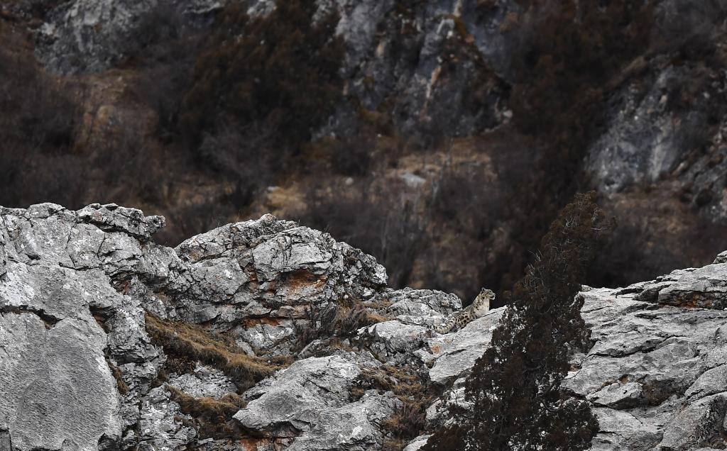 一只雪豹在位于三江源國家公園瀾滄江源園區內的青海省玉樹藏族自治州雜多縣昂賽大峽谷內休息(2023年2月21日攝)。新華社記者 張宏祥 攝