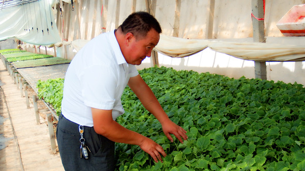 王亭榮在認(rèn)真察看蔬菜種苗長勢(shì)。