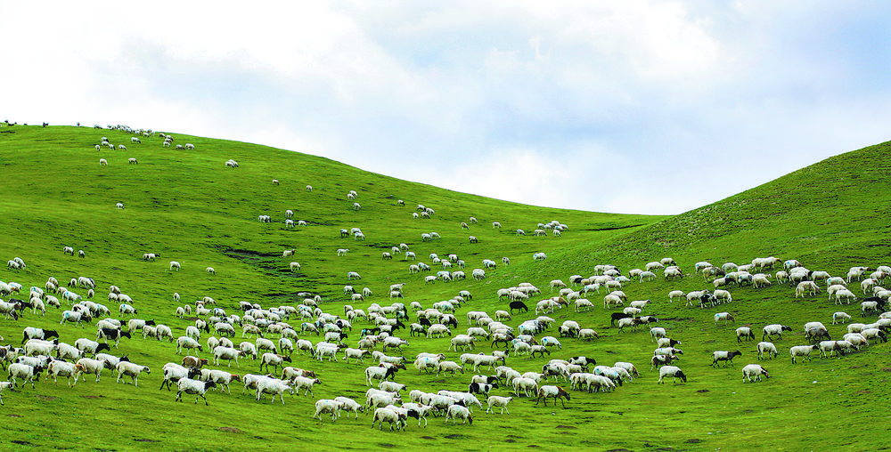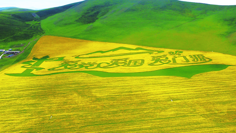 夏季的海北藏族自治州門源回族自治縣,天高云淡,遠處崗什卡雪峰,近處油菜花黃,綠色的草甸上,白色羊群點點“鑲嵌”,完全一副生態大美“圖景”。