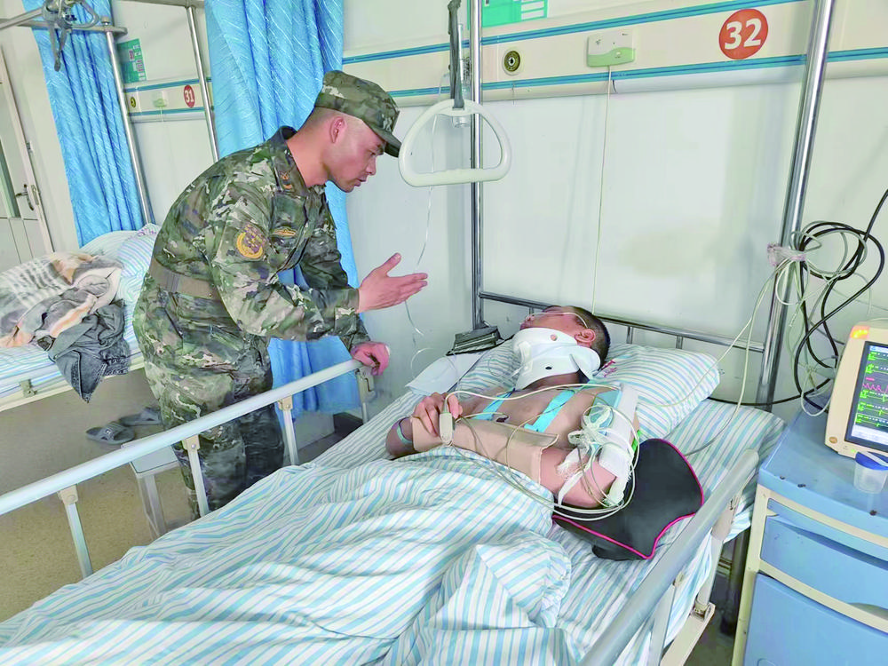 見狀,武警戰(zhàn)士們停好車,將傷者抬到巡邏車上,由駕駛員楊楠開車,大隊(duì)長(zhǎng)袁高強(qiáng)以及王賞護(hù)送傷者前往醫(yī)院,在經(jīng)過有信號(hào)的地方時(shí)向上級(jí)報(bào)告了情況。