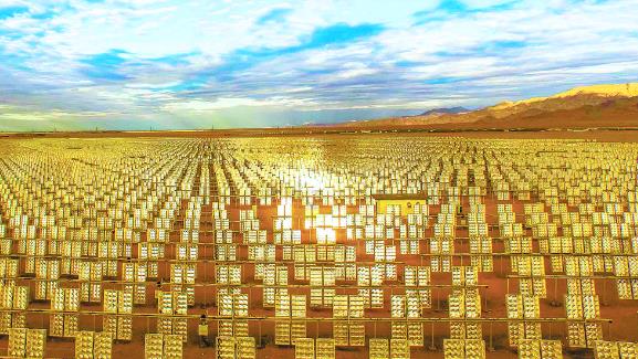 在位于青海西北部的柴達木盆地深處,一排排光伏發(fā)電板一望無際,猶如一片藍色海洋……在戈壁中延綿,陽光被它們瞬時轉(zhuǎn)換為電流,通過條條銀線奔流向遠方。這片曾經(jīng)的不毛之地如今依托新能源產(chǎn)業(yè)正不斷積蓄綠色動能。