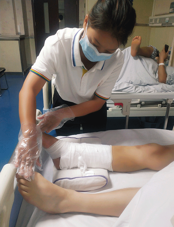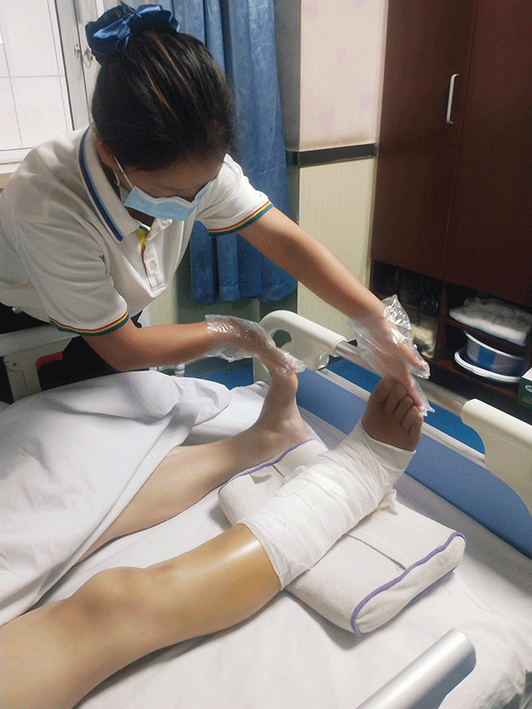 當李卓滿措護理患者的時候,她手法嫻熟,她說:“護理工作不僅是手法重要,理論知識也非常重要。比如說,當接收到腰椎受傷的患者,最怕的是尿潴留,所以要采用“問、看、聽、按”等幾個步驟,及時判斷患者是否長時間沒有排小便了,因為腰椎受傷嚴重的患者對小便不敏感,感覺不到是否想排尿。如果患者肚子鼓得不是很明顯,這時就要用自己的理論知識和工作經驗幫助患者排尿。如果在護工的幫助下還排不出尿,肚子鼓得厲害時,要第一時間告知護士,可能需要插入導尿管排尿。長期臥床的患者要預防各種并發癥,如下肢深靜脈血栓、肺炎、壓瘡、泌尿系統感染等……”