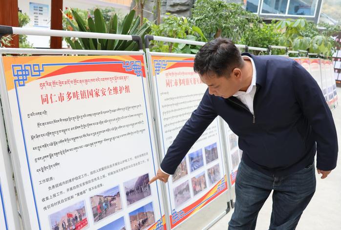 多哇鎮黨委書記周加卡向記者展示黨建引領基層社會治理專項工作組告示牌。