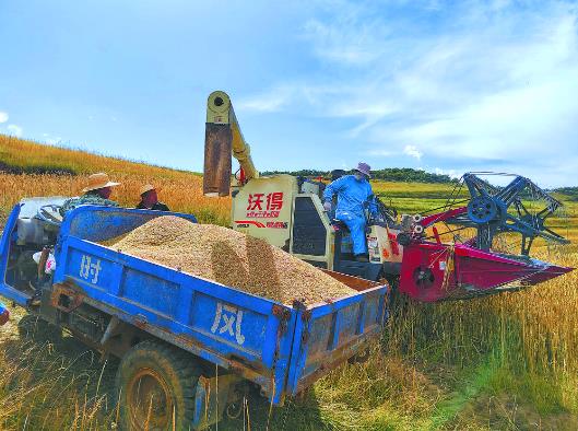 連日來,海北藏族自治州門源回族自治縣西灘鄉各村的農戶搶抓晴好天氣收割青稞,確保顆粒歸倉。田間的收割機、糧食運輸車等農業機具輪番作業,在金色的青稞田中來回穿梭。金黃飽滿的青稞粒從收割機中傾瀉而下,農戶忙著將脫粒的青稞裝袋上車,臉上洋溢著燦爛的笑容,田間地頭忙碌的身影繪就出一幅欣欣向榮的秋日豐收圖。丁玉梅 吳海寧/攝