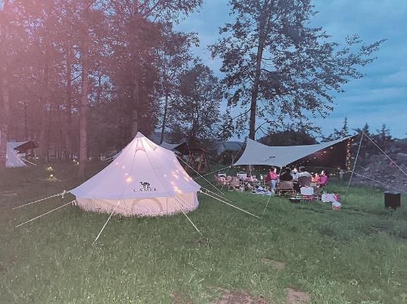常冬梅說,目前,“田園牧歌”自助游營地已建有停車場1處、天幕、桌椅、帳篷、燒烤炊具、兒童游樂設施等設施12套(組),設置管理崗、服務崗等,解決村民就業30余人,帶動20余戶農戶制作農家美食,并銷售土特產。