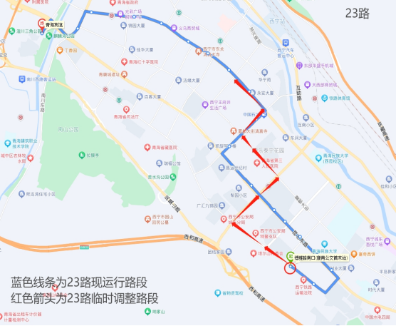 23路公交車由康南公交首末站始發,經南山東路、湟中路、夏都大街、德令哈路恢復原線路,返回時同路線。臨時取消德令哈路“城東區政府西”東西兩側公交站停靠。臨時增設湟中路“第五人民醫院西、康西新村”東西兩側、夏都大街“花園路口、果洛路”南北兩側公交站點停靠。