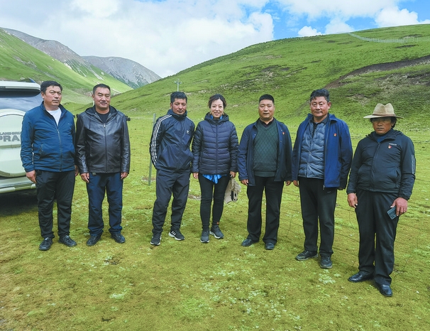 阿保地是陪同玉樹市農牧局科技辦主任才仁卓嘎等人一同前來督查工作的。我們相見很高興,早就知道阿保地是玉樹市畜牧獸醫站站長,全國“三農人物”,在本地是響當當的畜牧獸醫專家,有許多一線實踐,還獲得農業農村部頒發的“全國最美農技研究推廣員”的稱號。我們站在草場上,熱聊起與獸醫相關的話題。