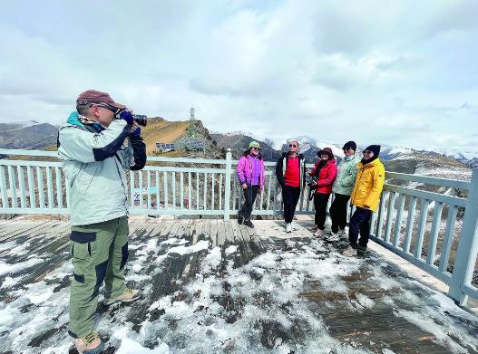 10月20日,通向山頂的木棧道上,有游客舉起相機和手機“咔嚓咔嚓”拍照留影。“我們的隊伍共有8人,分別來自北京、四川、江蘇,平均年齡60歲了。大家從武漢集合,一路向西自駕,領略祖國的大好河山。今天,我們從瀾滄江源雜多縣趕過來,特意看看治多的長江第一灣。三江源地區都是沒有人工雕琢的自然美景,而且這里民風淳樸,人們熱情好客。這次來玉樹的旅游體驗真棒!”第一次來玉樹的北京游客張曉光說。