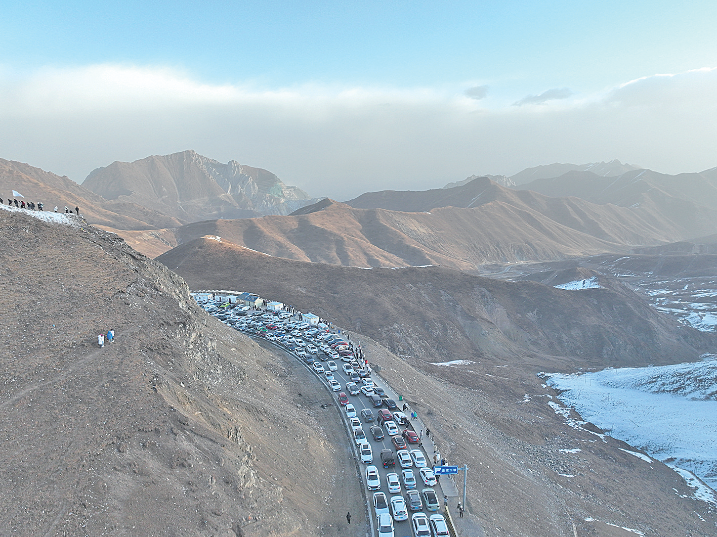 為了奔赴一場日出,程雨鑫和家人凌晨5時就從西寧出發(fā),前往拉脊山。程雨鑫說,前往拉脊山頂?shù)难赝荆缆穬蓚?cè)停滿了來自各地的自駕車。因為降雪,有部分車輛無法到達,游客便下車徒步前往山頂觀景臺。